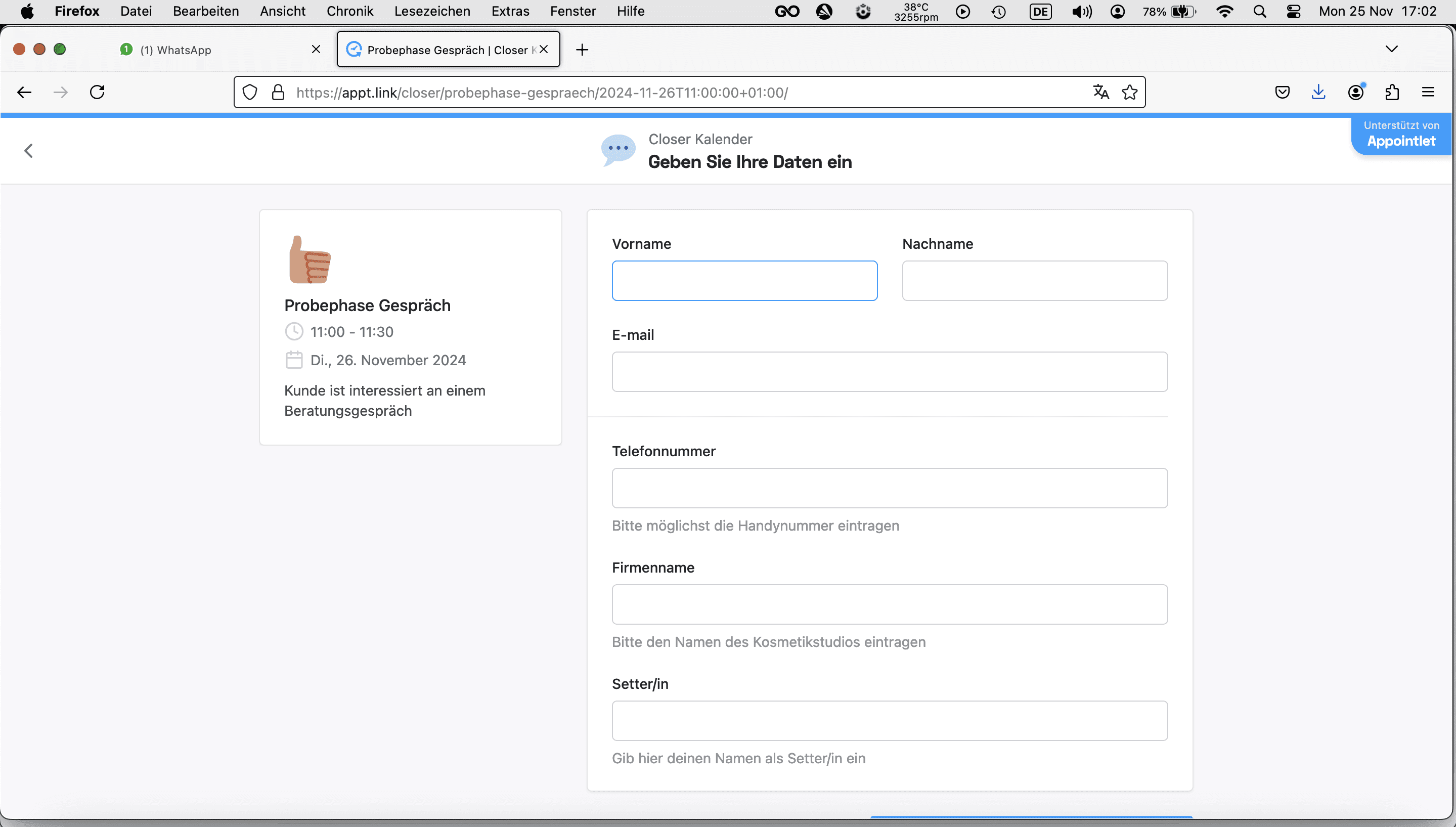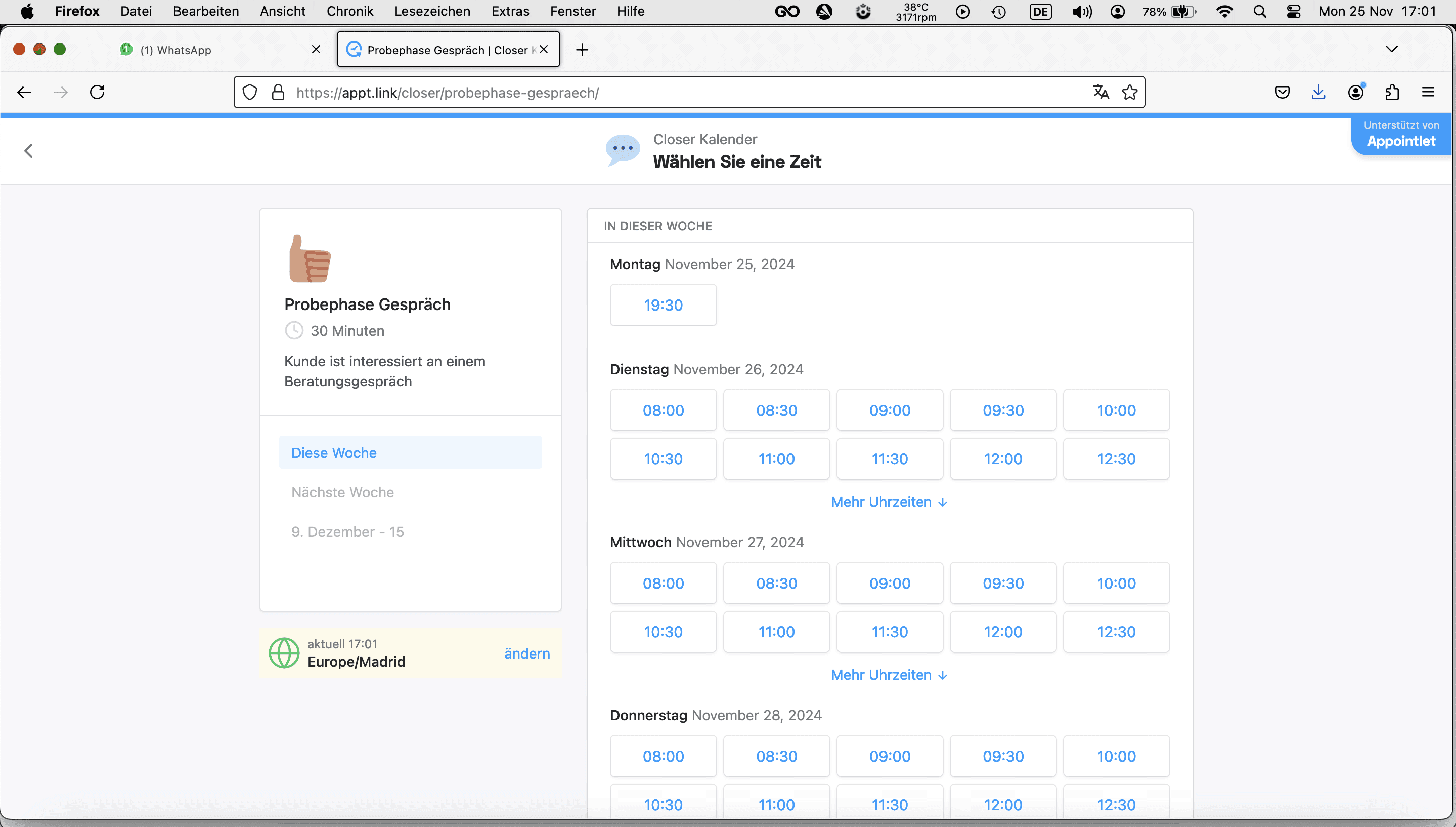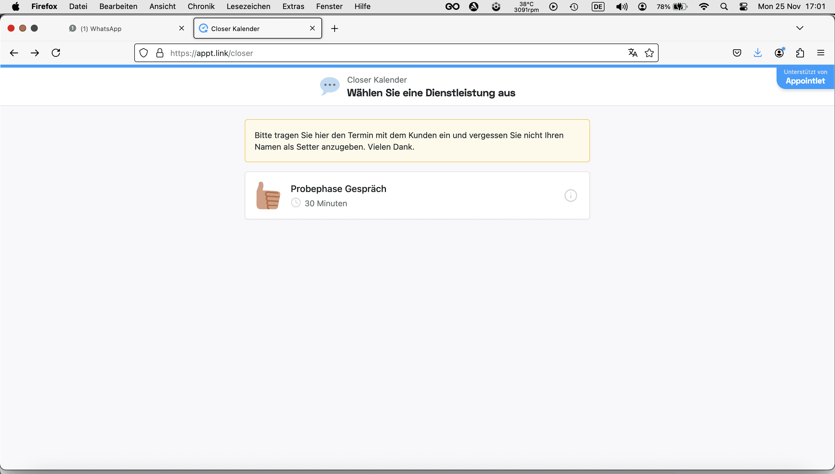 Geh auf die Website https://appt.link/closer und klick auf den Kalender "Probephase Gespräche"