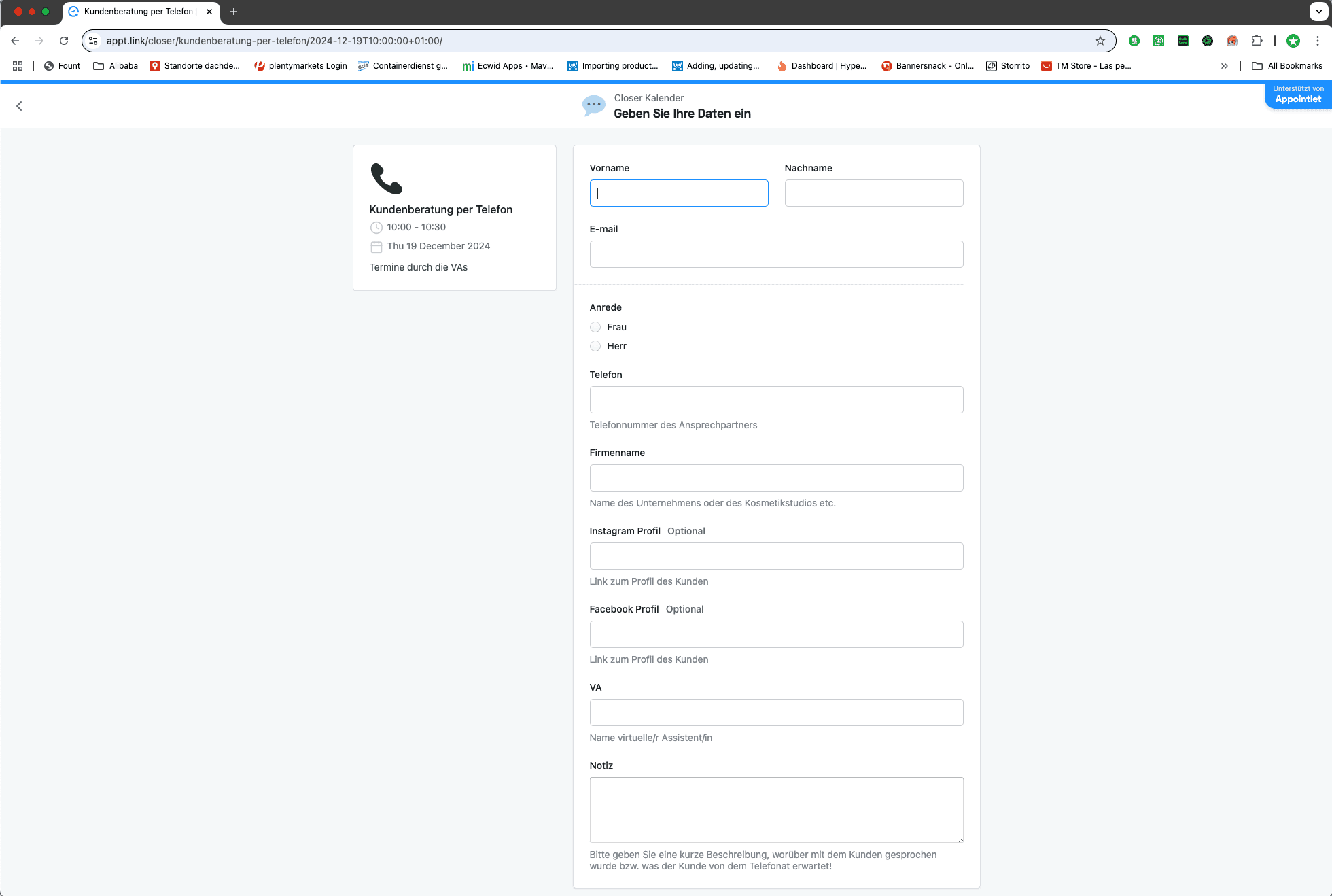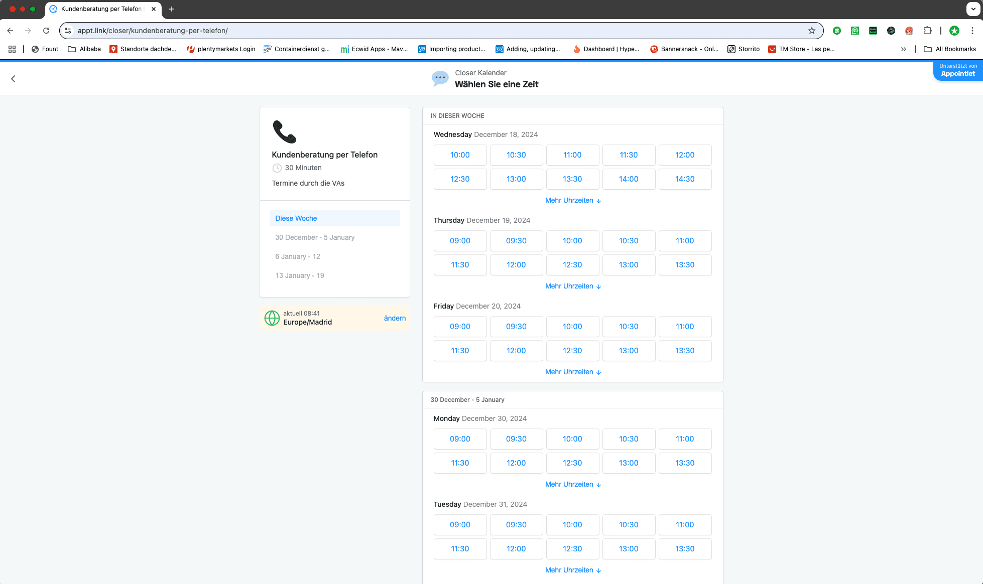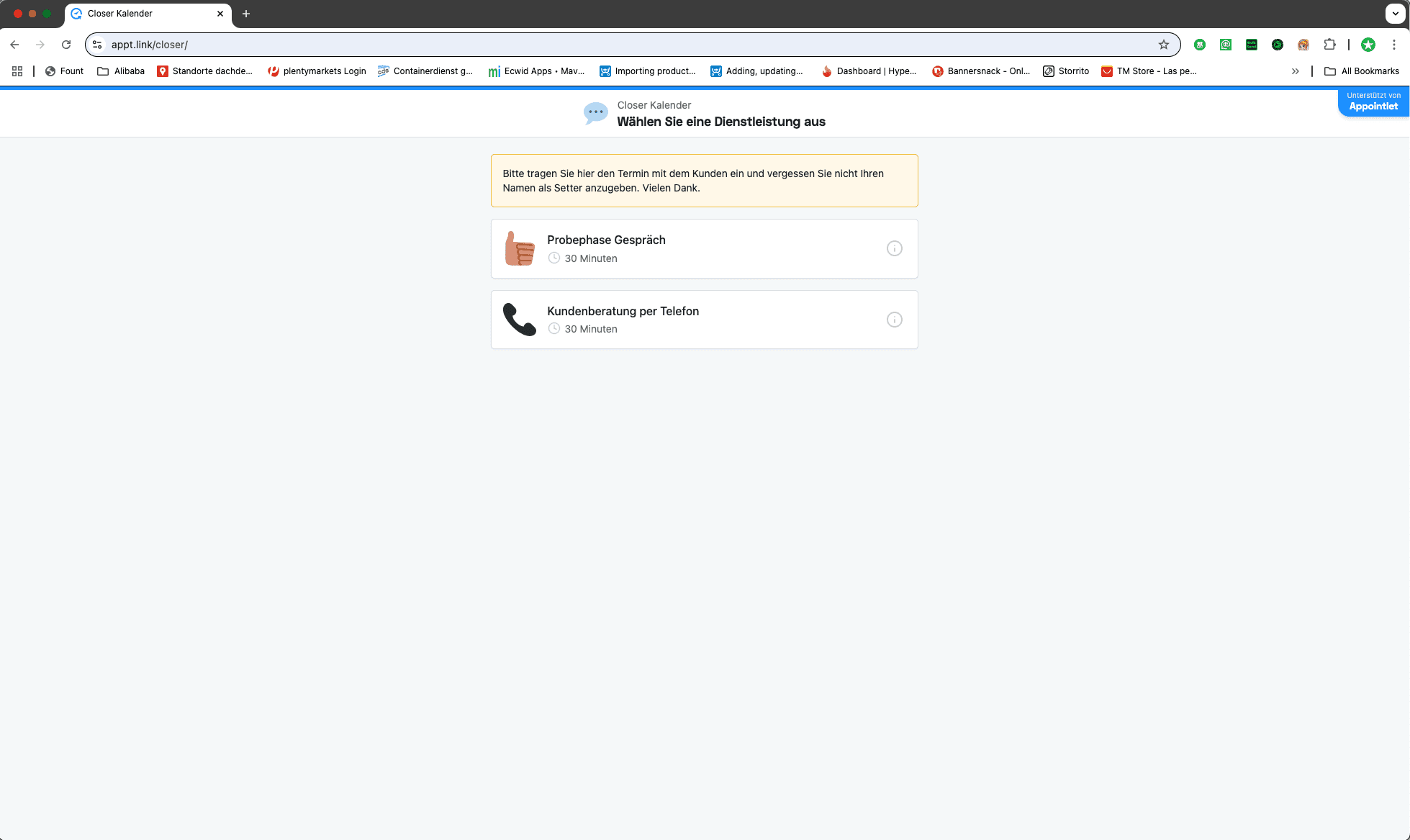 Geh auf die Website https://appt.link/closer/ und klick auf den Kalender "Kundenberatung per Telefon"