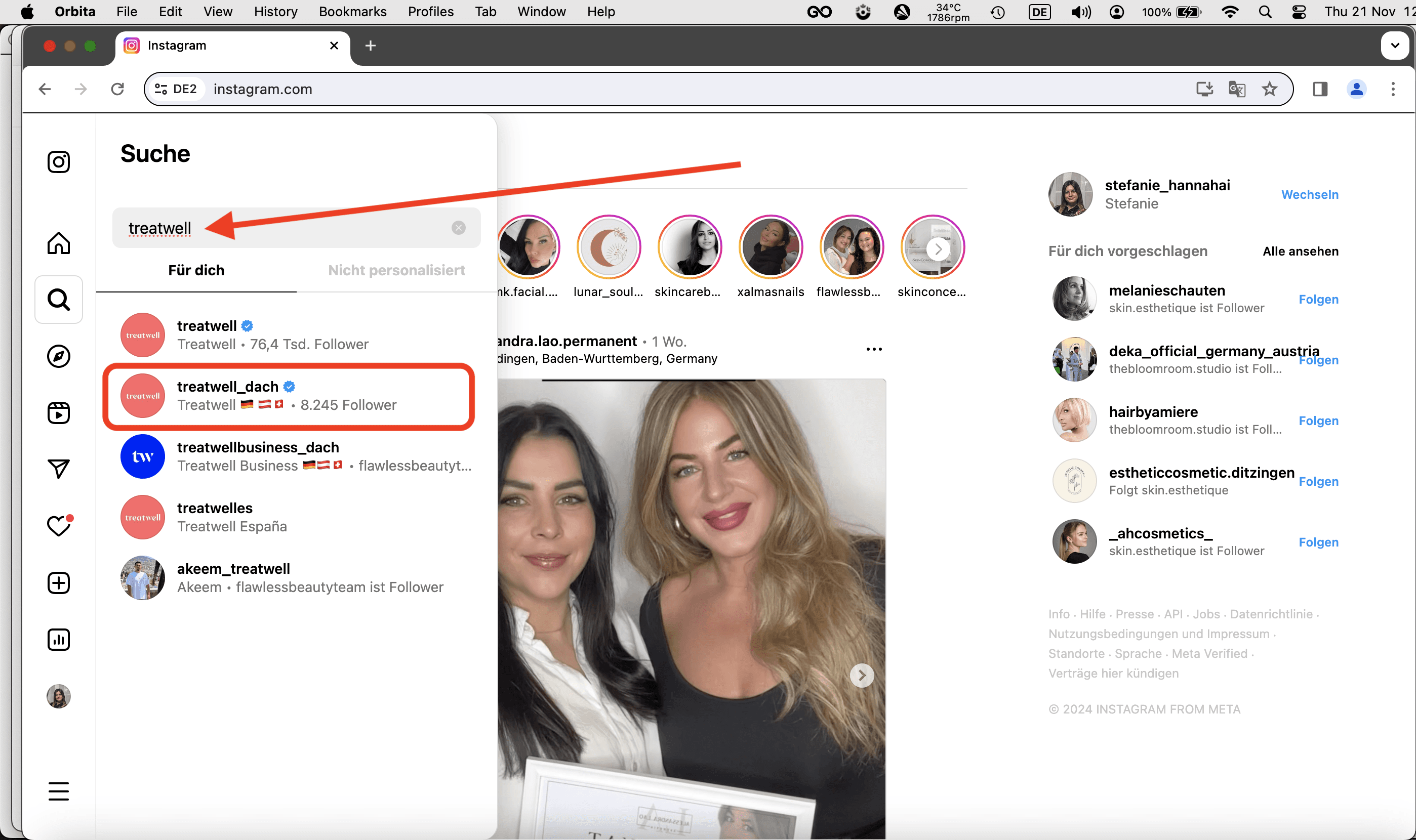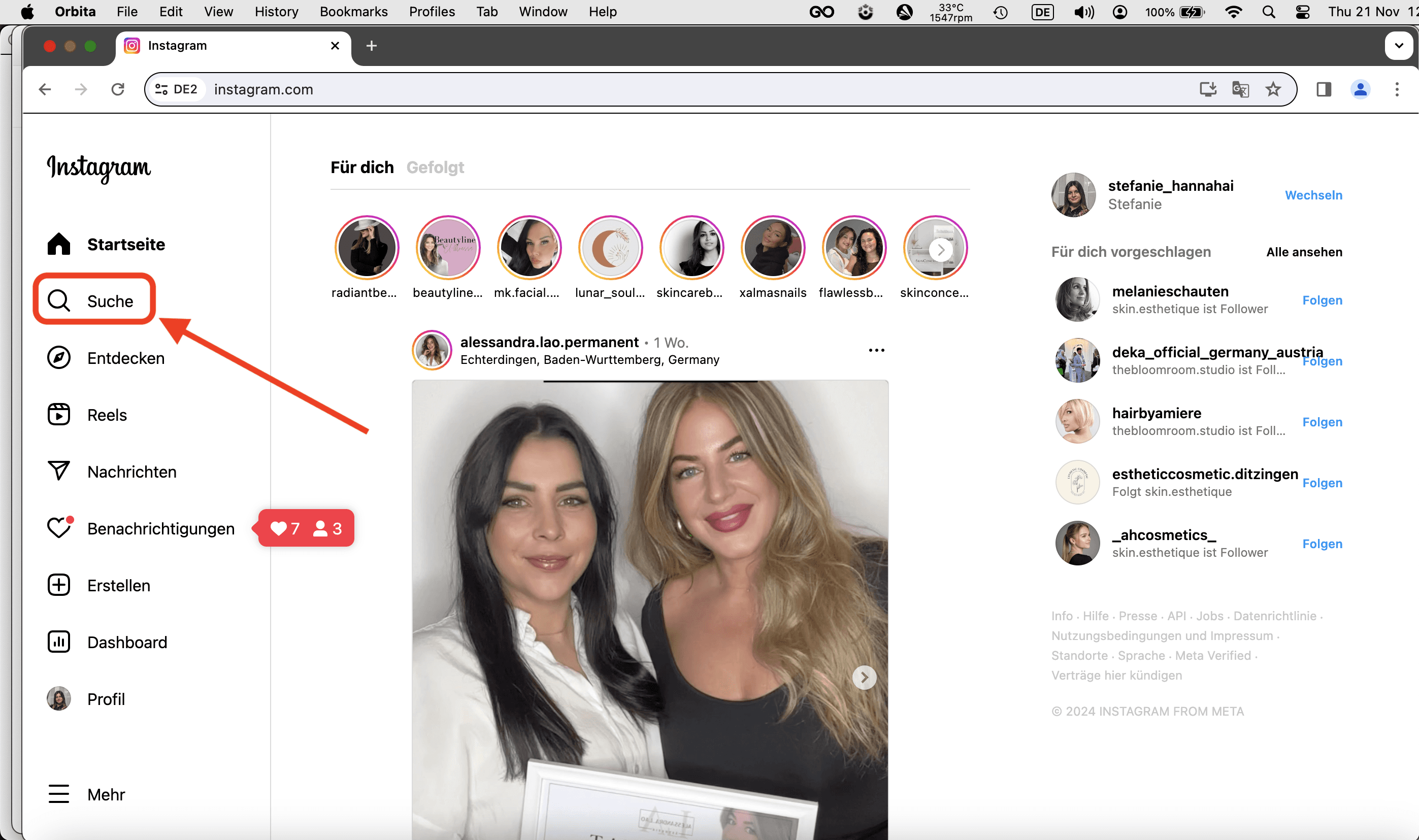 Nach der erfolgreichen Anmeldung geht ins Suchfeld von Instagram rein