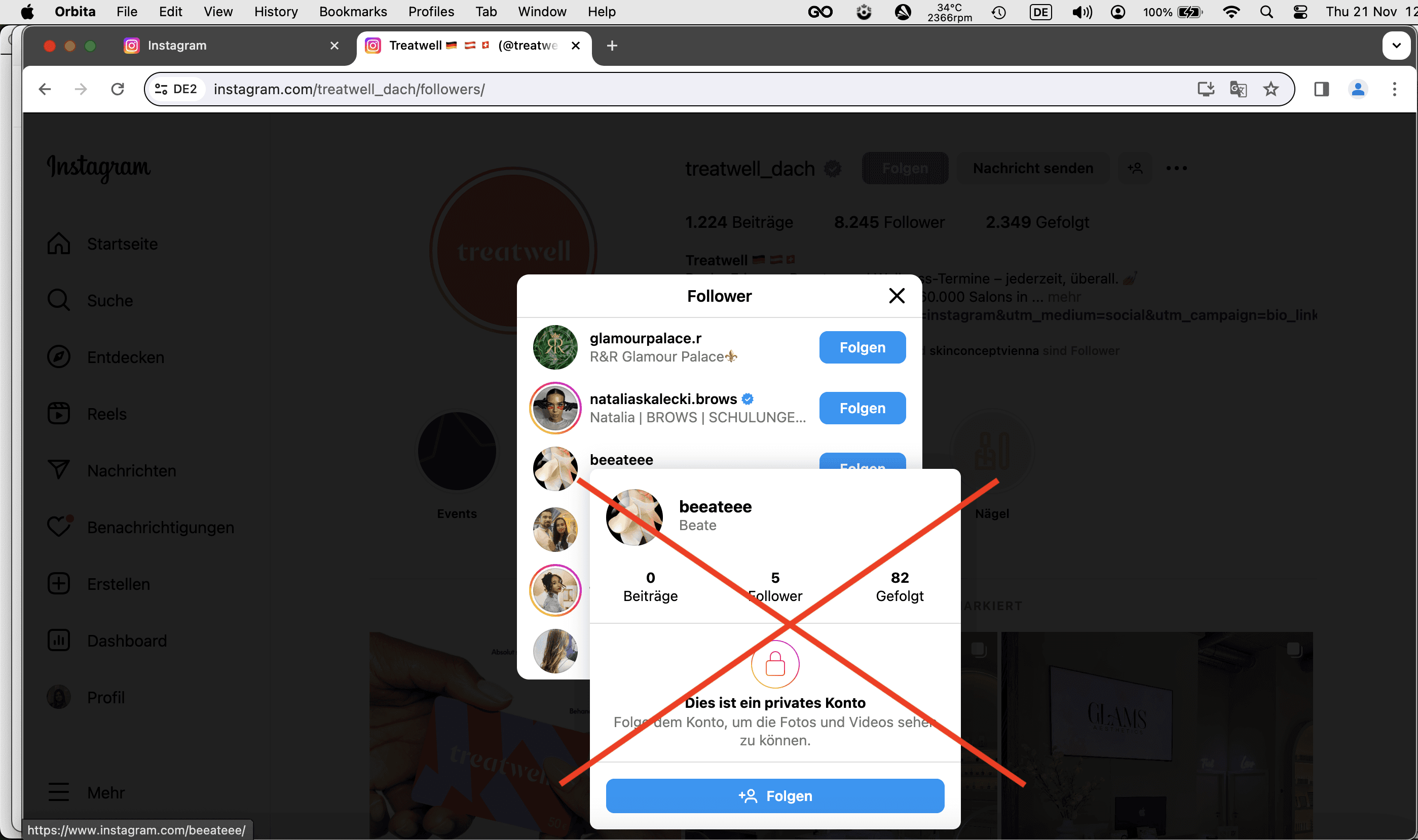 Follower Account darf nicht privat sein